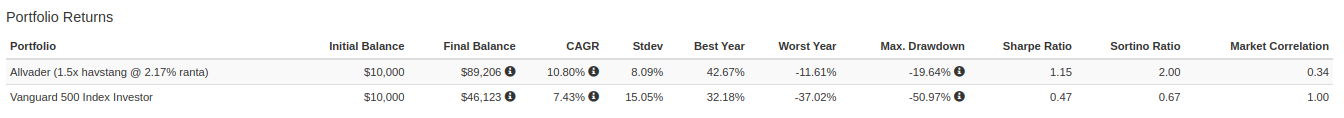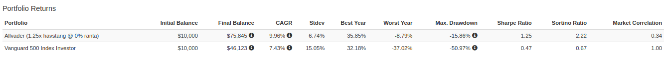 Dock är meravkastningen fortfarande klart högre än vid 1.25x hävstång @ 1.19% ränta i absoluta tal.