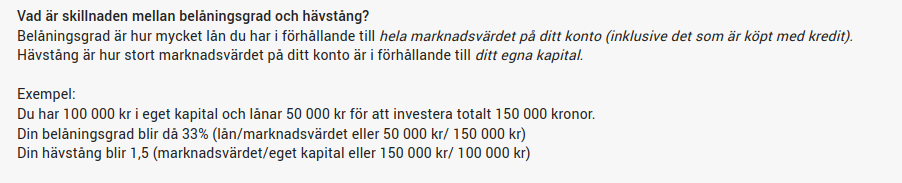 Hoppas ni alla har noterat den extra variabeln som Nordnet har kastat in i smeten dessutom? Om man har flera instrument kan de få högre faktiskt belåningsgrad än vad som står listat för respektive instrument. Nordnet skriver ut det som ”Ökad belåningsgrad”.