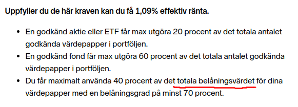 - Summan av dina aktier/fonder som uppfyller kravet för ränterabatt (dvs minst 70% belåningsgrad)