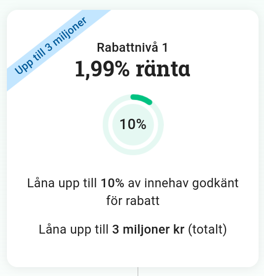 Du kan numera låna upp till 3 miljoner kronor till 1,99 % ränta. Men eftersom belåningsvärdet på värdepappren inte är 100 % och du behöver marginal för börsens svängningar kan det kanske vara lämpligt att ha 40 - 50 miljoner kr investerat i värdepapper innan du lånar så mycket.