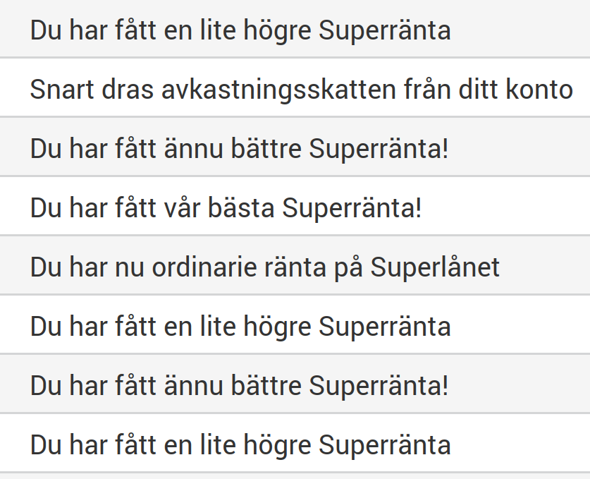 Jag har sida upp och sida ner med aviseringar. Om man vill slippa höjd ränta gäller det att ta till extra marginal.