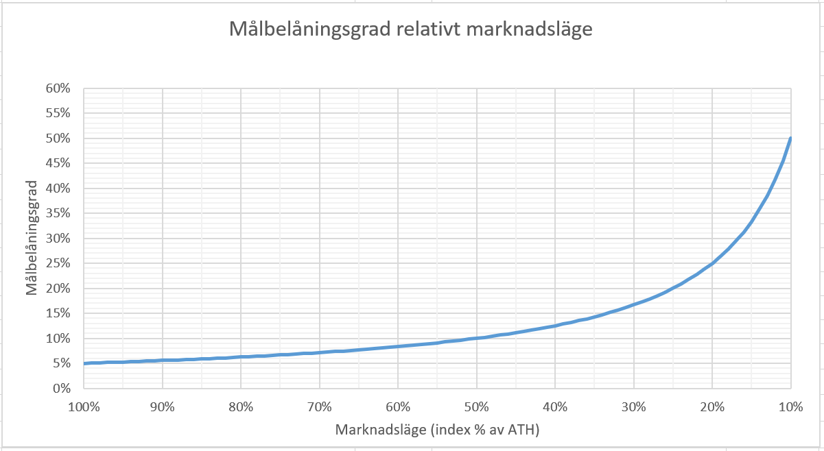 Instämmer helt i metodiken här. Nyckeln för mig är att ha definierat hur stor belåningsgrad jag max kan tänka mig att uppnå vid ett börsfall om x% från ATH. Utifrån det kan man rita upp en graf som visar vad belåningsgraden “bör vara”, och faktiskt blir, beroende på börsläge. Inga överraskningar. Effekten i praktiken av att bör-värdet anpassar sig efter marknadsläge blir att vid varje månadsspar tillskjuts ju pengar → sänker belåningsgraden → tillåtelse att köpa fonder för lite mer än vad månadssparandet självt är för att återställa belåningen till börvärdet.