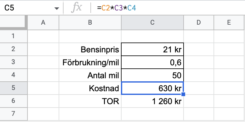Du skriver först in det som står i cellerna C2, C3 och C4. Texten i B-kolumnen är bara till för att förtydliga. “kr” betyder att jag valt att formatera cellen som valuta men det behöver du inte.