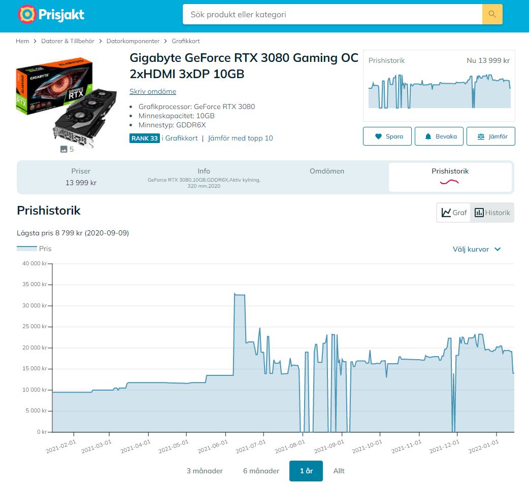 Kostnad för ett RTX 3080 i december 2020 var ~7900kr, och i december 2021 minst 15000kr (med scalper priser från amazon etc. på över 20000kr), se: https://www.prisjakt.nu/produkt.php?pu=5509033.