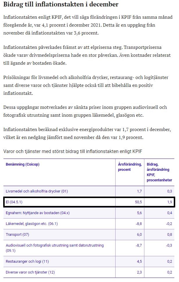 Har lekt lite med siffrorna efter att elräkningarna damp ner i min inbox för sista kvartalet 2021. Enligt SCB ökade priserna för el med 50% i december: