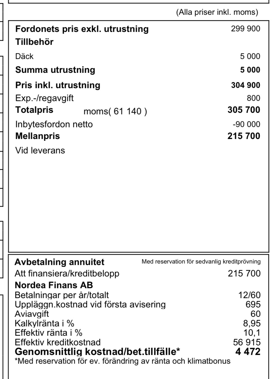 Jag har aldrig lånat pengar vid bilköp. Känns korkat. Visst, med facit i hand kaaaanske det hade lönat sig om jag var säker på att jag hade kunnat placera pengarna med högre avkastning än räntekostnaden för lånet. Men så hög tilltro har jag inte till min investeringsförmåga.