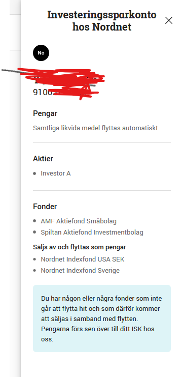 Ah det var dumt av mig att sälja kanske men jag kände mig snål och ville inte betala för Nordnets flytt av värdepapper när jag ändå skulle byta från Nybörjar till Rikatillsammans och byta ut flera fonder I värsta fall får jag flytta det till sparkonto 1 månad och så föra över till Avanza 1 april, tack för tips!