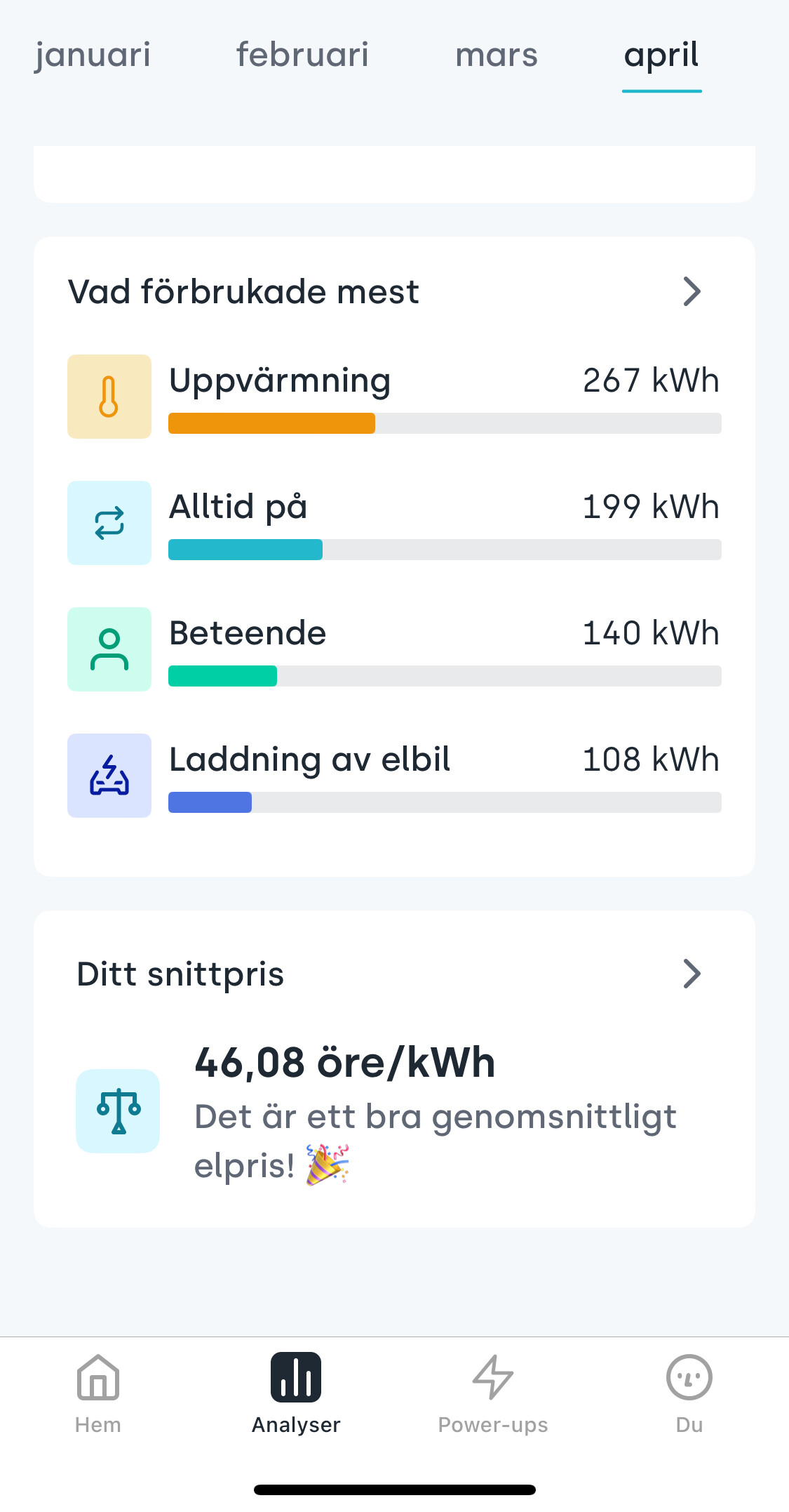 Man måste scrolla ner i vyn Analyser, total förbrukning står högst upp och snittpris finns längst ner