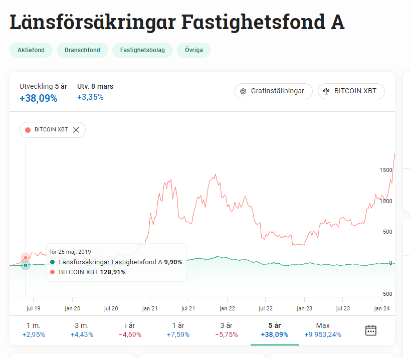 Precis som guld givet i allvädersportpföljen då det inte korrelerar med börsen och har andra egenskaper. Ska vi snacka CAGR är Bitcoin överlägset det mesta senaste åren.Kör man ceritifkat så det finns inget banken har att invända mot det.