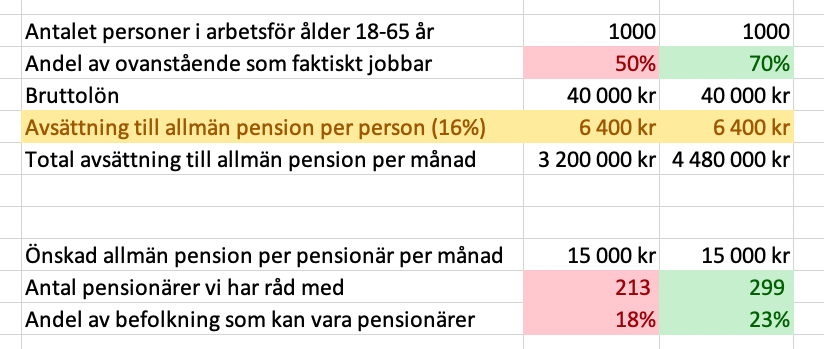 Det är faktiskt lite svårare än så, om än att matten precis som du säger är enkel. Jag överdriver med siffrorna för att visa min poäng: Antag att 50% av de personerna som är i arbetsför ålder jobbar, och det som de betalar in till pensionssystemet räcker för att finansiera pensionen för de som går i pension vid en viss ålder. Allt är i jämvikt som idag. Antag att det istället skulle vara 100% av de i arbetsför ålder som skulle jobba och betala in lika mycket i procent. Plötsligt skulle det finnas dubbelt så mycket kapital i systemet. Det skulle, allt annat lika, leda till att man har råd att finansiera dubbelt så många pensionärer. Vilket alltså skulle kunna möjliggöra för personer att leva en dubbelt så lång pension - helt utan att en enskild individ betalar in mer än idag. Men det bygger på att alla gör det, annars behöver ju varje individ som faktiskt betalar in betala in mera som du säger.