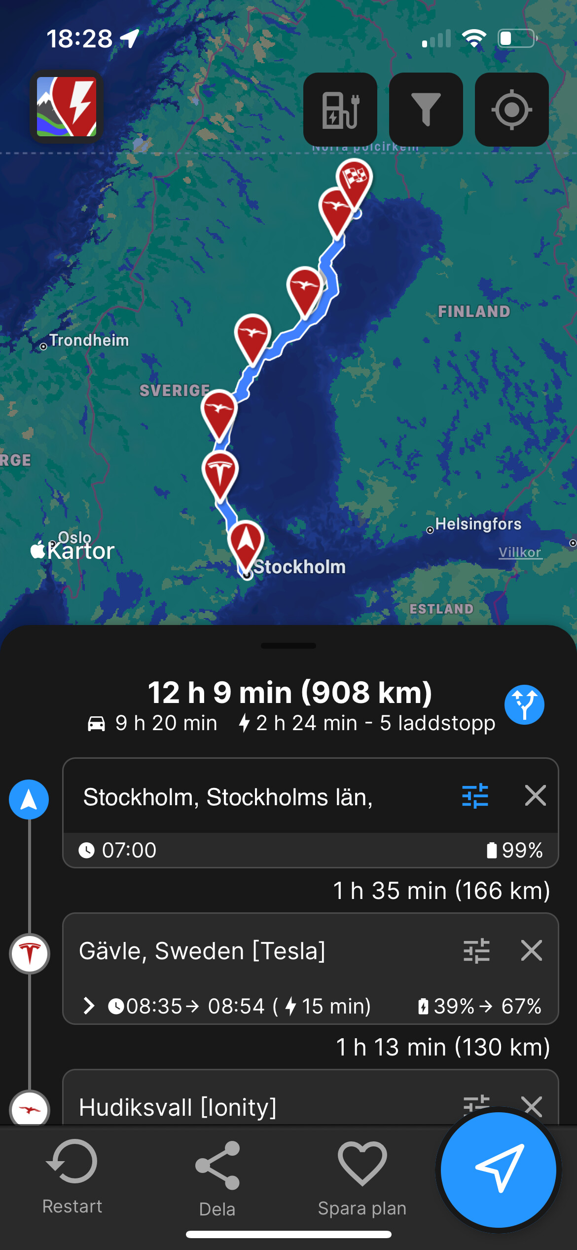Sommartid klarar man sig med tre laddstopp (varav två nära burgarställen, så man hinner ladda rätt mycket medans man äter, dvs inte speciellt mycket dötid att vänta på laddning), medans man gärna i vinterperioder som dessa vill ha lite mer marginal så blir att lägga till en eller två korta stopp.
