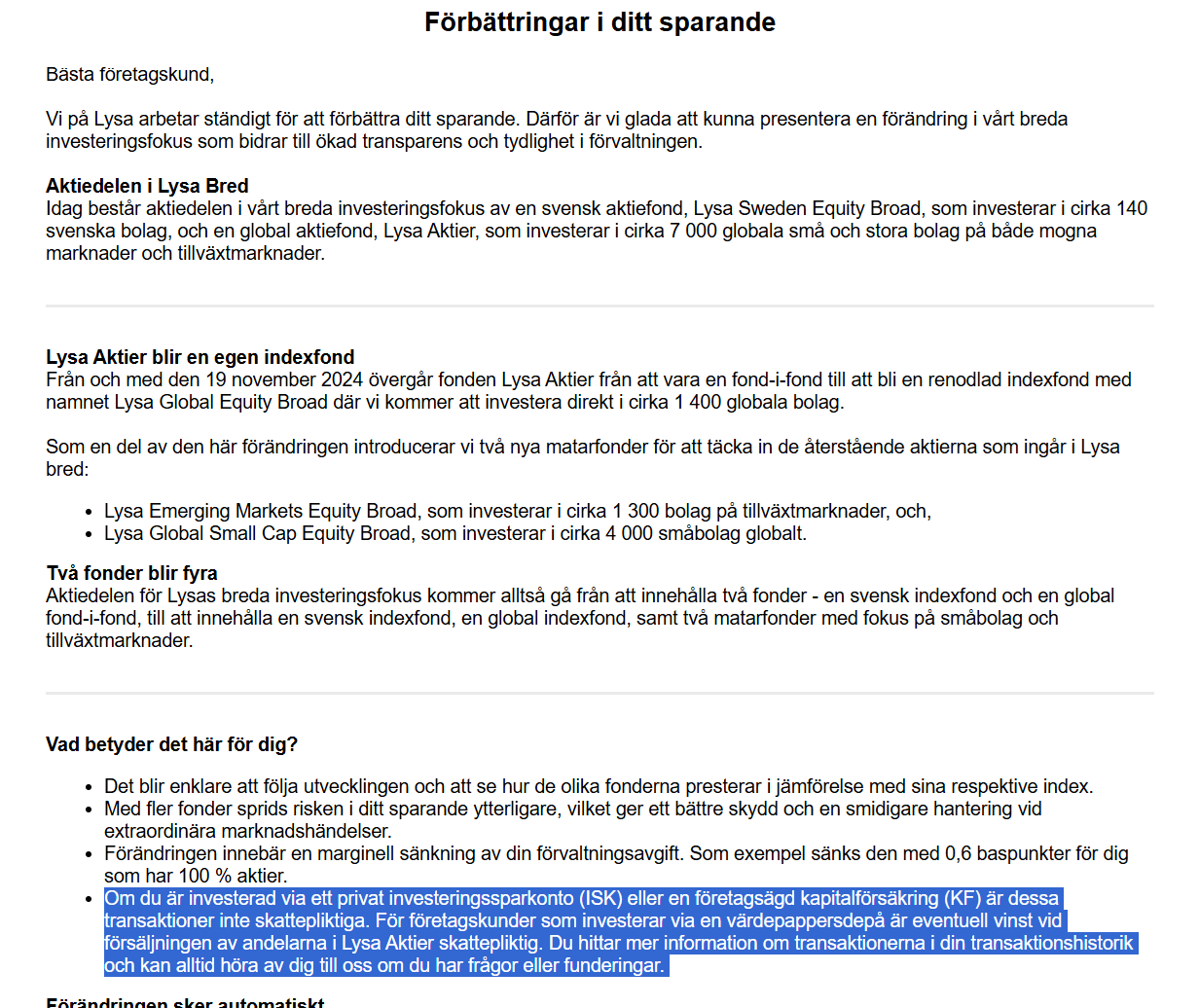 I november genomförde de dock en förändring av värdepappersdepån för företag, vilket innebar att alla andelar såldes och sedan placerades om. Jag fick alltså aldrig ut någon “vinst” till mitt företagskonto, utan pengarna har bara flyttats runt på Lysa.