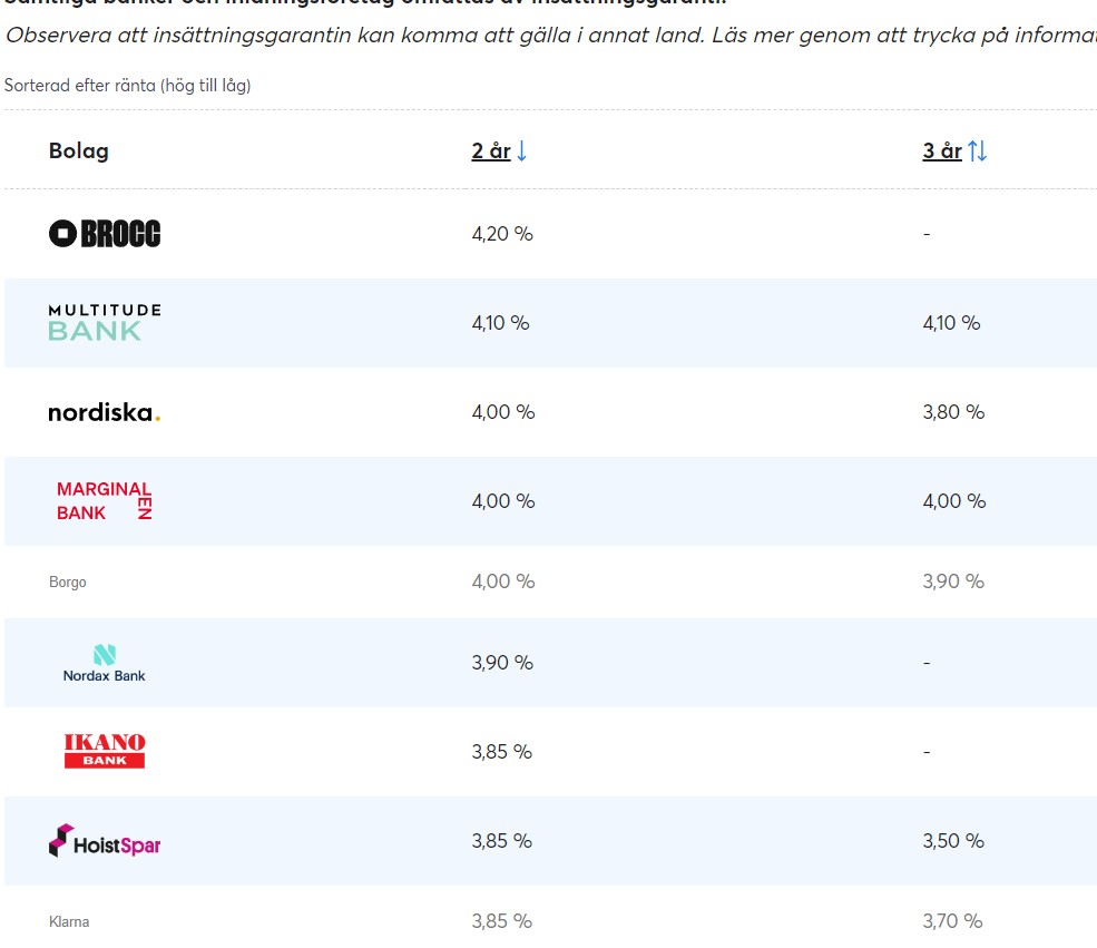 Så beroende på situation och tankar framåt (T ex hjälpa barn med kontantinsats lägenhet osv) så hade jag personligen valt att behålla en skvätt lån några år till. “bara för att”. Det kapital du nu har tillgängligt för att betala av lånet med kan du ju istället sätta på fasträntekonto med 1-3 års löptid. (se bild nedan på sparräntor) Ger då 3,5-4% garanterad ränta/avkastning och ditt banklån kanske får en ränta på 4,5-5% ränta framöver. Så i praktiken är det bara “mellanskillnaden” efter ränteavdrag som är din faktiska kostnad för att avvakta med att amortera.