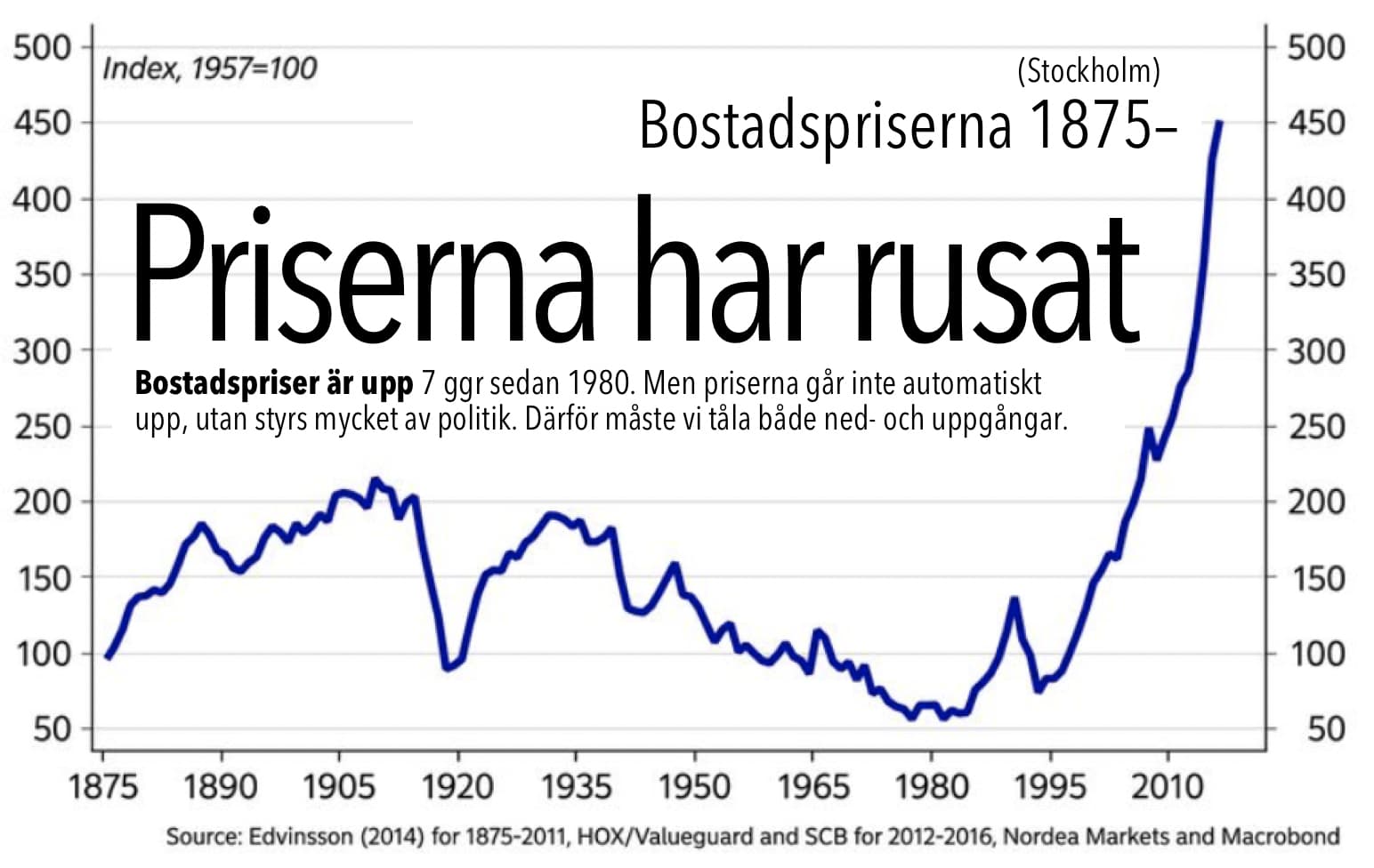 Dom senaste 30 årens prisuppgång på bostäder är ett undantag i historiken. Det har publicerats grafer här av Jan Bolmesson (?) med mycket lång historik +100 år och bopriserna har ökat med inflationen nästan hela tiden förutom de 30 senaste åren.