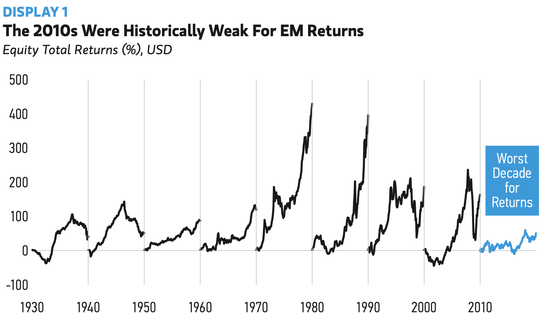 Tycker de gick exakt lika bra tills början av 2013 enligt MSCI-grafen? Och det är väl rätt så logiskt eftersom tillväxtmarknader underpresterat sista decenniet. Men det är snarare ett undantag än regel att tillväxtmarknader underpresterar, se graf från Morgan Stanley.