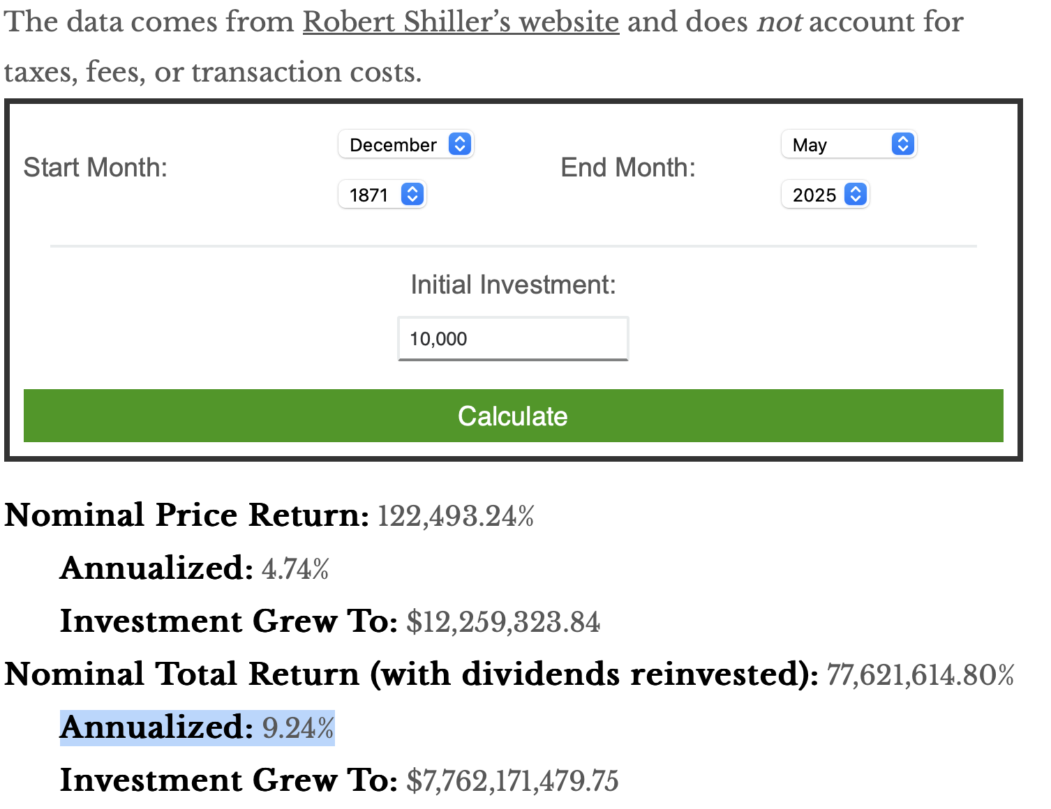 Försökte hitta siffror för S&P500. S&P 500 Historical Return Calculator [With Dividends] – Of Dollars And Data säger att S&P500 har haft 9.24% från 1871 till idag