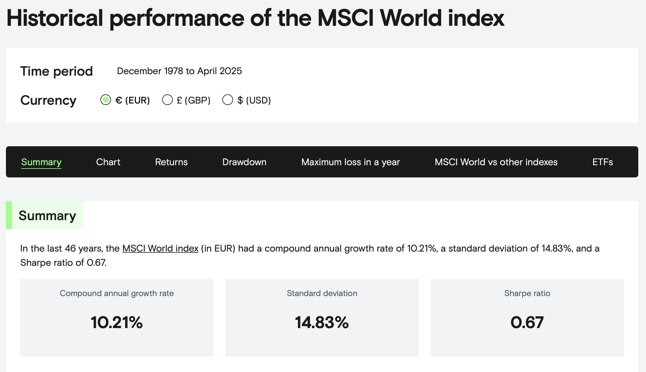 Försökte hitta data för MSCI World, Backtesting for the European index investor säger att det haft 10.21% sen det indexet startade för 46 år sen till idag.