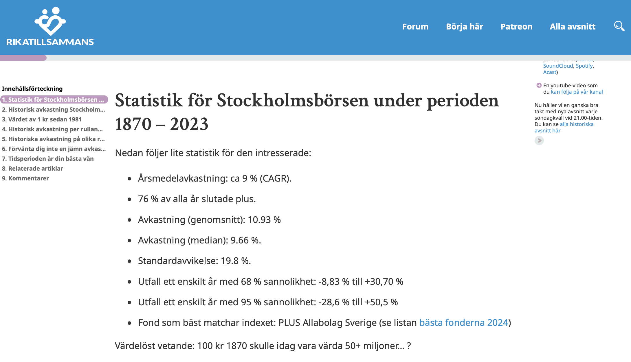 Rikatillsammans (Stockholmsbörsen (SIXRX) historisk avkastning 1870 - 2023) säger att stockhomsbörsen gått 9% mellan 1870-2023.