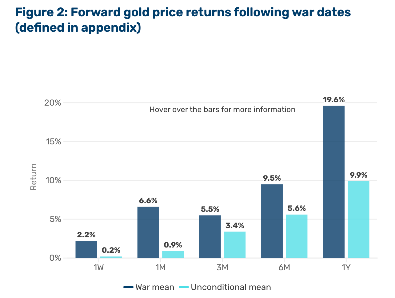 The most reliable war hedge there is, at least on historic precedent examined here. ‘Fiat’ means ‘let it be done’. Fiat currencies are a kind of alchemy, whereby a government pronouncement imbues value to paper. There’s nothing like a bit of wartime turbulence to have people question the pronouncer, and revert to old-school money. That big red deficit-spend button can look mighty tempting when you’re in a fight. Per Figure 2, gold is positive 85% of the time in the five post-event days, stays above 60% on virtually every look-forward, and runs well above the unconditional mean on all.