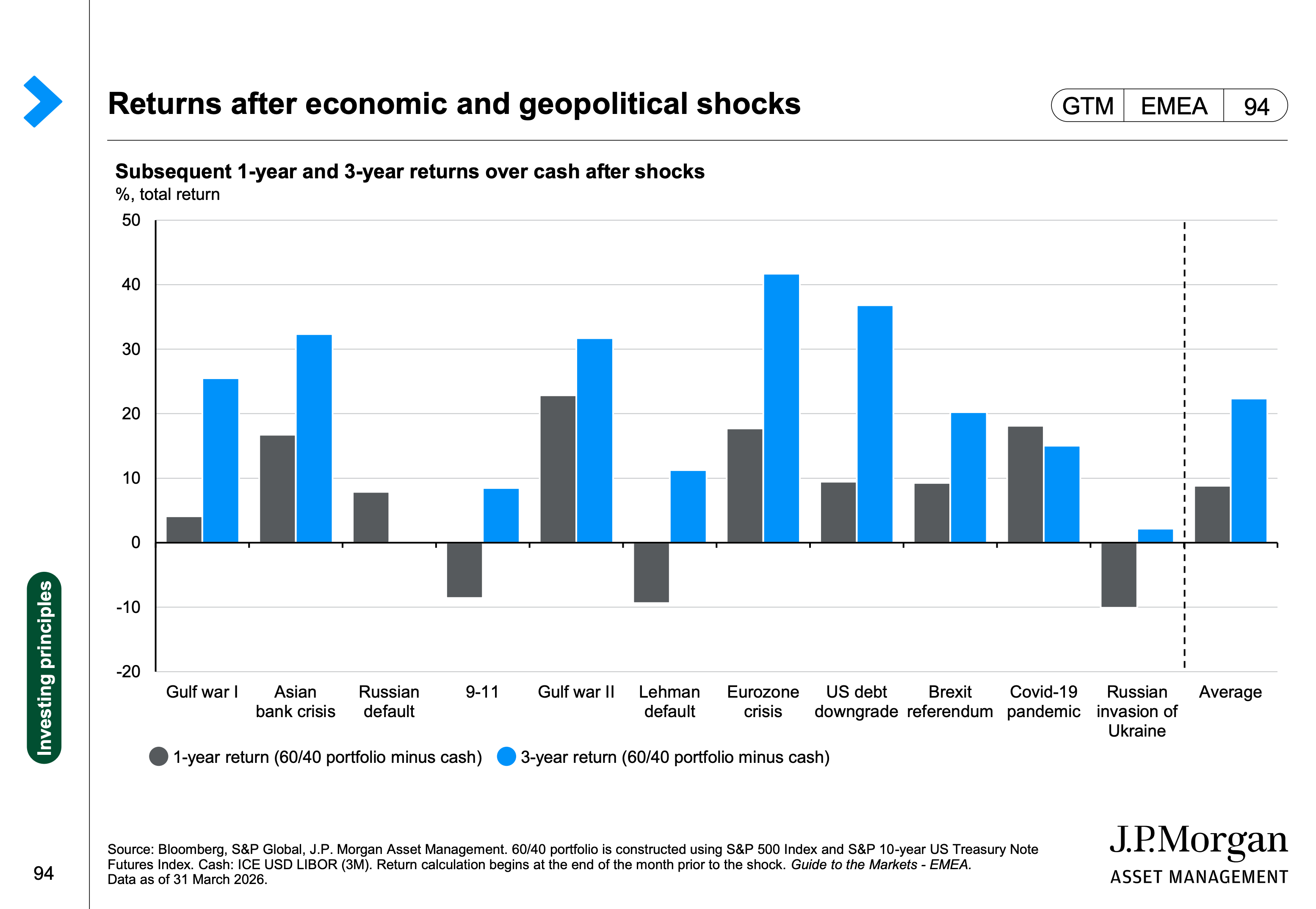 Hittade en ny graf för 12 resp. 36 månader efter en geopolitisk kris med en 60/40-portfölj minus kontanter.