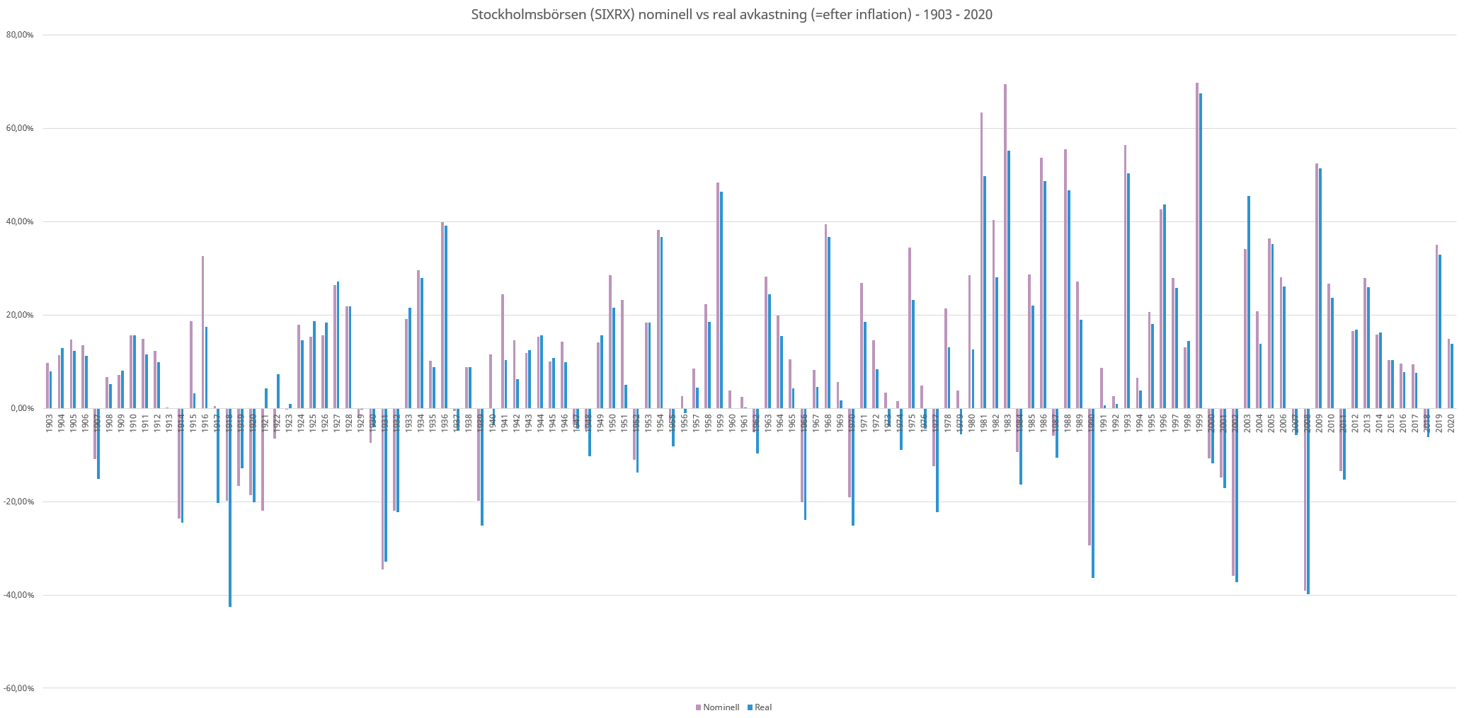 Jag googlade lite på inflation historiskt och såg att åren 1974-1984 var inflationen över 8%. Men enligt diagrammet i förra blogg-avsnittet gick Stockholmsbörsen upp alla år utom två. Så det verkar ju inte stämma. Eller betyder det bara att börsen hade stigit ännu mer med en lägre inflation?