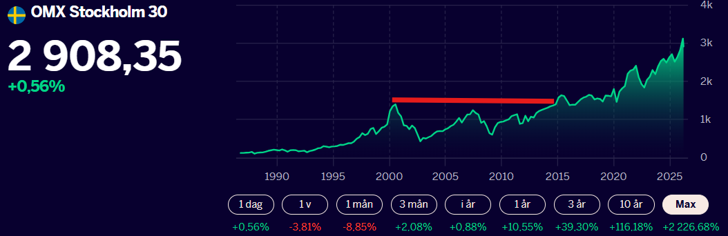 Och dessa skräckhistorier om att det tog 15 år att komma upp på noll igen baseras på att man köpte hela innehavet exakt på toppen. Något som sker väldigt sällan utan köpen sprids över tid och snittas ut. Om man inte försöker tajma marknaden förstås genom att hoppa in och ut, så kanske man köpte allt på absoluta toppen