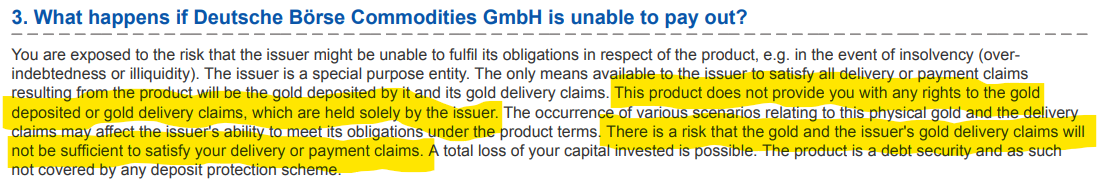 Xetra Gold is a zero-coupon bond broken down into units which have an indefinite term, are denominated in one gram of gold, are 100 per cent physically backed and securitise a right to delivery. Using this product, the bond holder’s economic position is intended to correspond to physical ownership of the corresponding amount of gold.