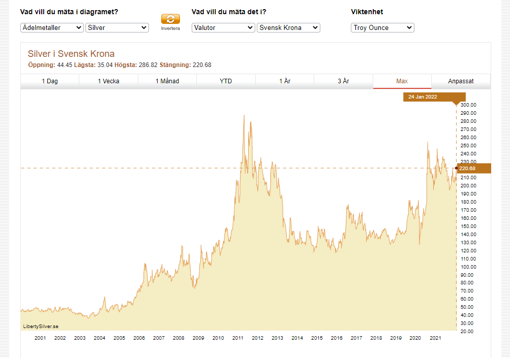 Silvermynten som jag fick av min far i början på 00 talet har åtminstone gått rätt bra, så där en 8% om året. Enkronor från 1968 och tidigare innehåller silver för runt 20 kr, och de från 1942 och tidigare innehåller silver för runt 40kr. Skadar inte att ha några kg sådana ![]()