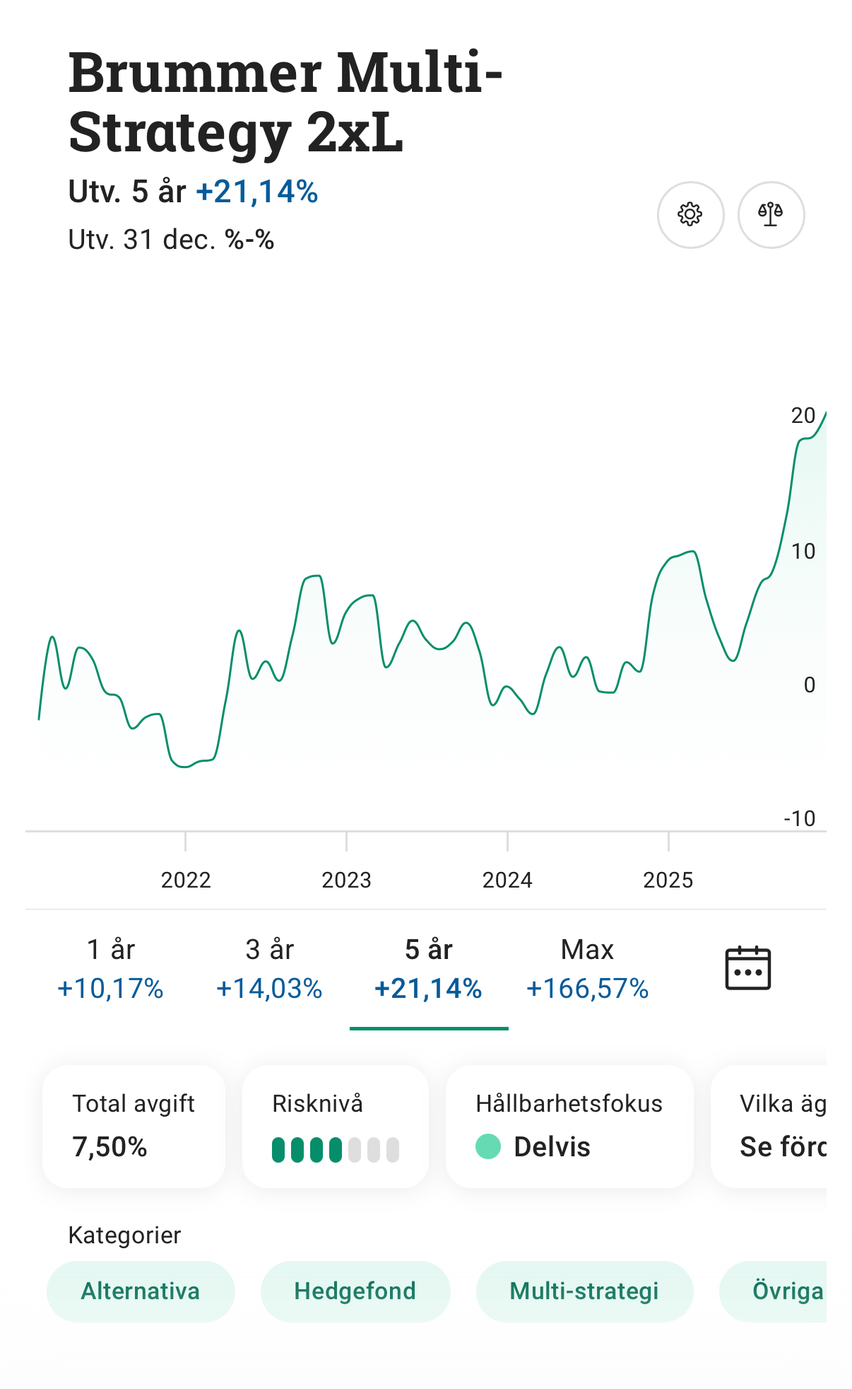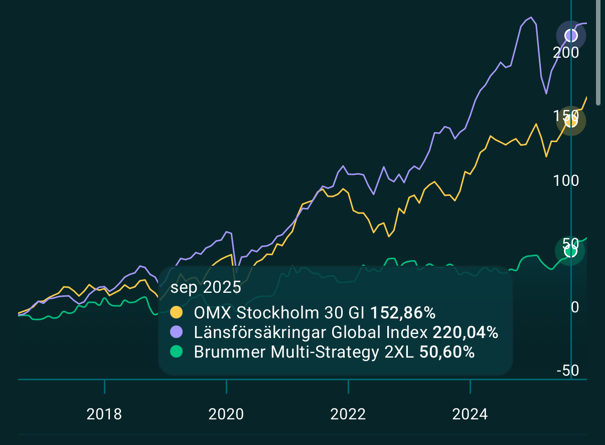 Till min fråga, satsade runt 500’ på Brummer multi strategy 2 XL år 2020, har sedan dess satt in ytterligare ca 115’, totalt 615’ det är det enda som gått bra av mina investeringar och är nu värt ca 850’ undrar hur ni tycker att jag ska göra, vet att den är dyr men har genererat nästan 50%, borde jag sälja och köpa de föreslagna indexfonderna ändå?