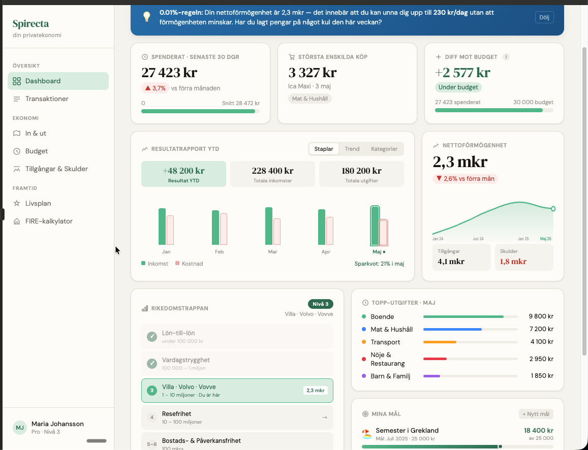 Otroligt kul, det är väldigt likgt de banorna jag tänkt, “RT + AI + praktisk guide” som man hade velat få in i en app. Kanske inte behöver vara endgame för Spirecta utan kanske en revamp precis som du håller på med. Jag ser att det finns en “Framtids” sektion i menyn där. Det hade ju varit så smooth att integrera med sin bank så att den automatiskt får koll på ens situation och kan ge prognoser. Men finns Spirecta som mobil app? Det känns som att det är där man måste vara för att nå den breda massa. Nu finns det både: