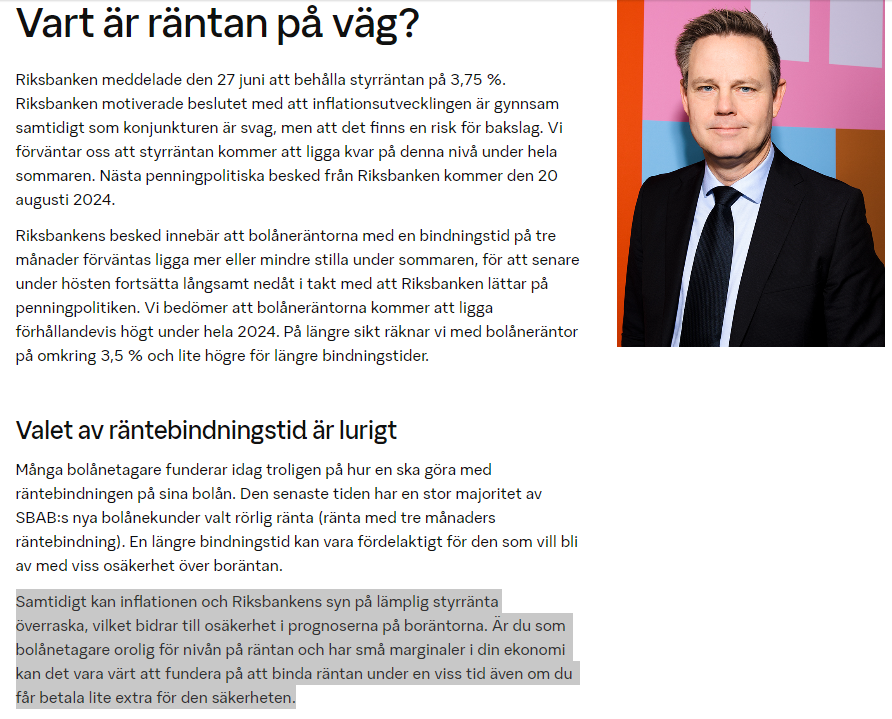 Men visst, det är ju just det, prognoser… Som du säger, vill man sova gott med risken att förlora någon procentenhet per månad framöver så är det ett klokt val. Ett annat alternativ är att binda delar av lånet om det är uppdelat. Men har man marginaler är det nog trots allt klokast att ligga kvar på rörligt…