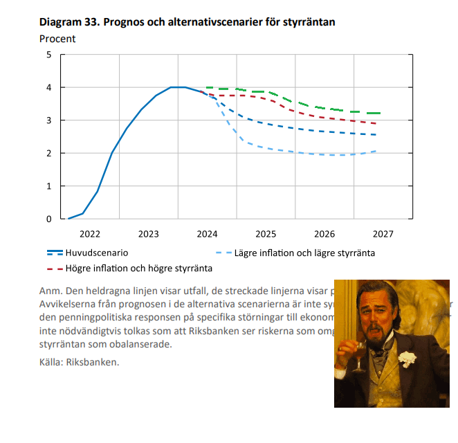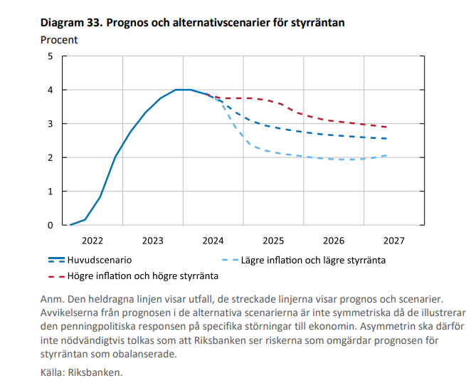 Riksbanken själva (hur mycket man nu ska tro på RB…) ställer upp de här huvudscenarierna: