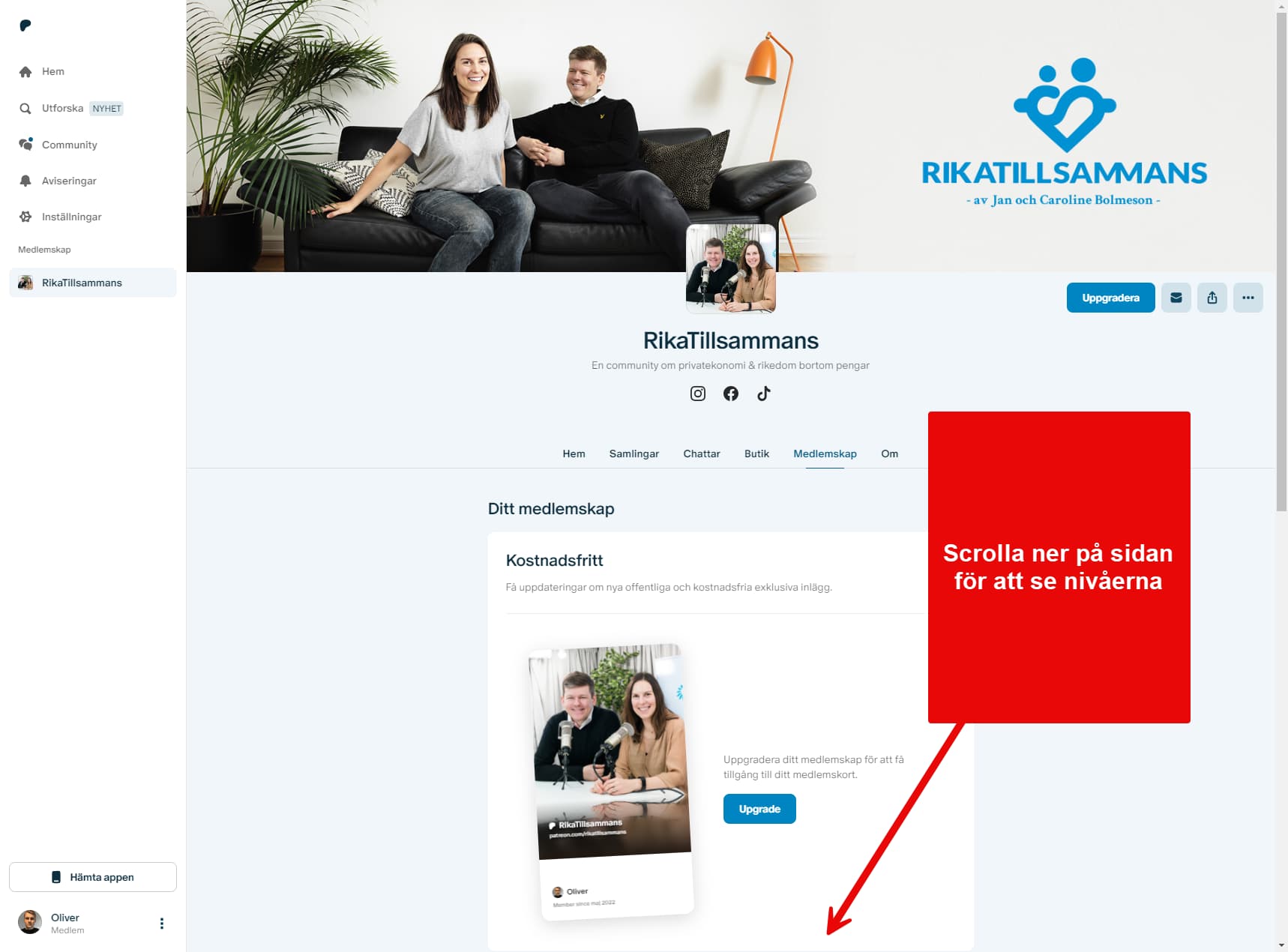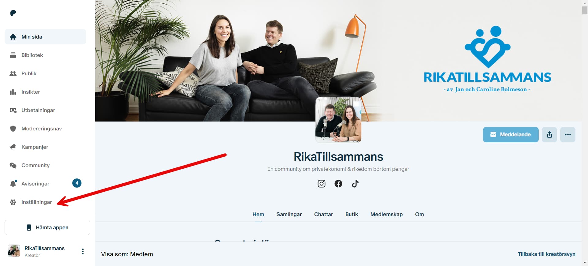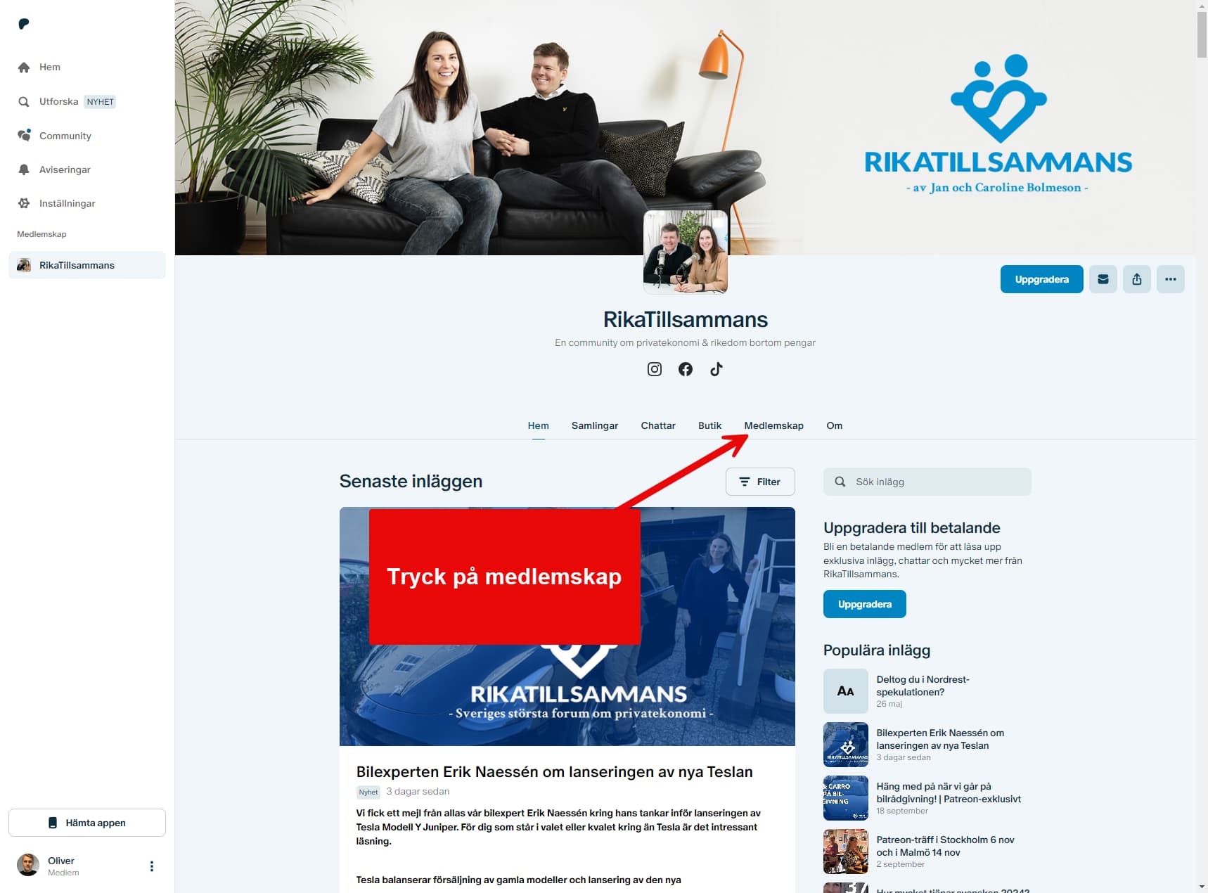 - I inloggat läge på din Patreons startsida tryck på Rikatillsammans i menyn till vänster.