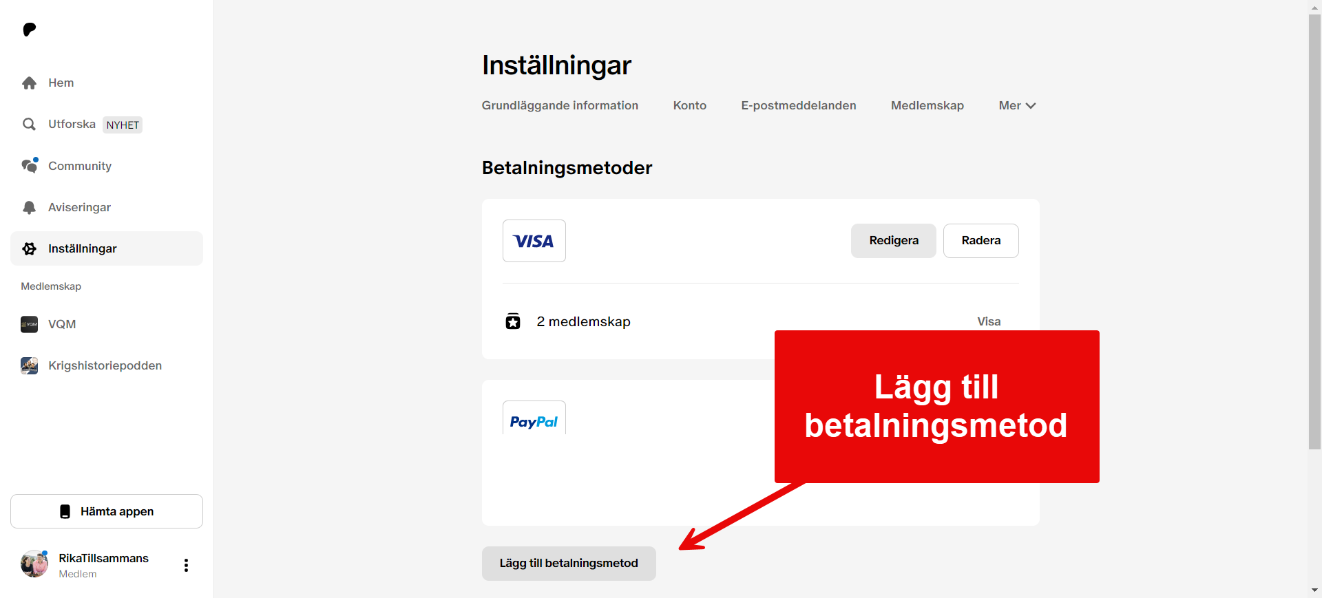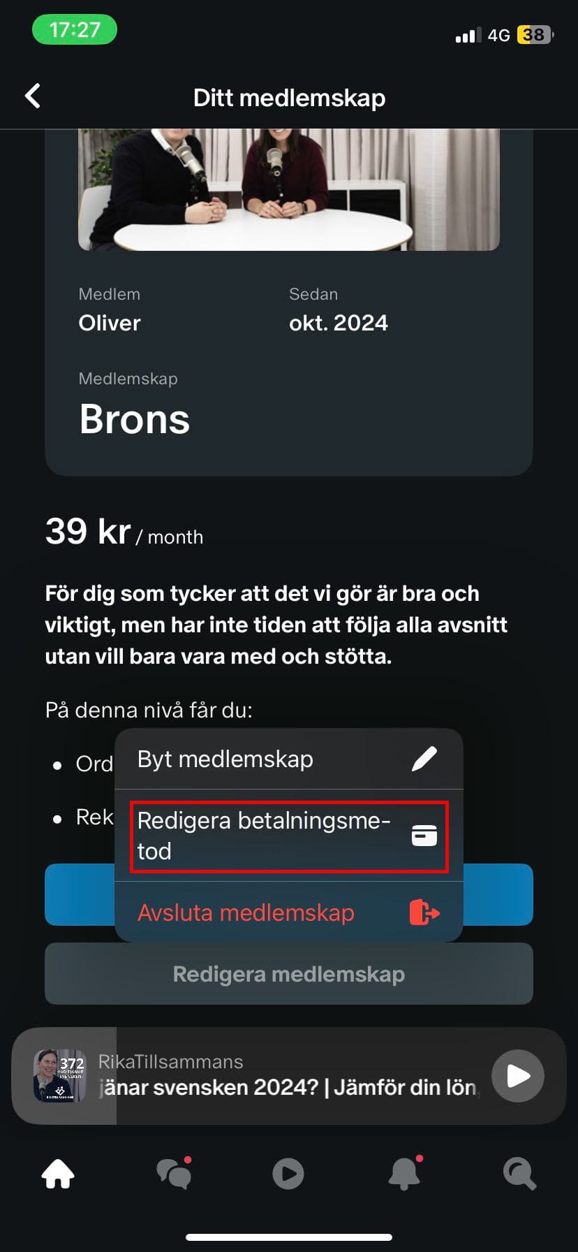 - Scrolla ner på sidan och tryck på knappen “redigera medlemskap” och därefter “redigera betalningsmetod”