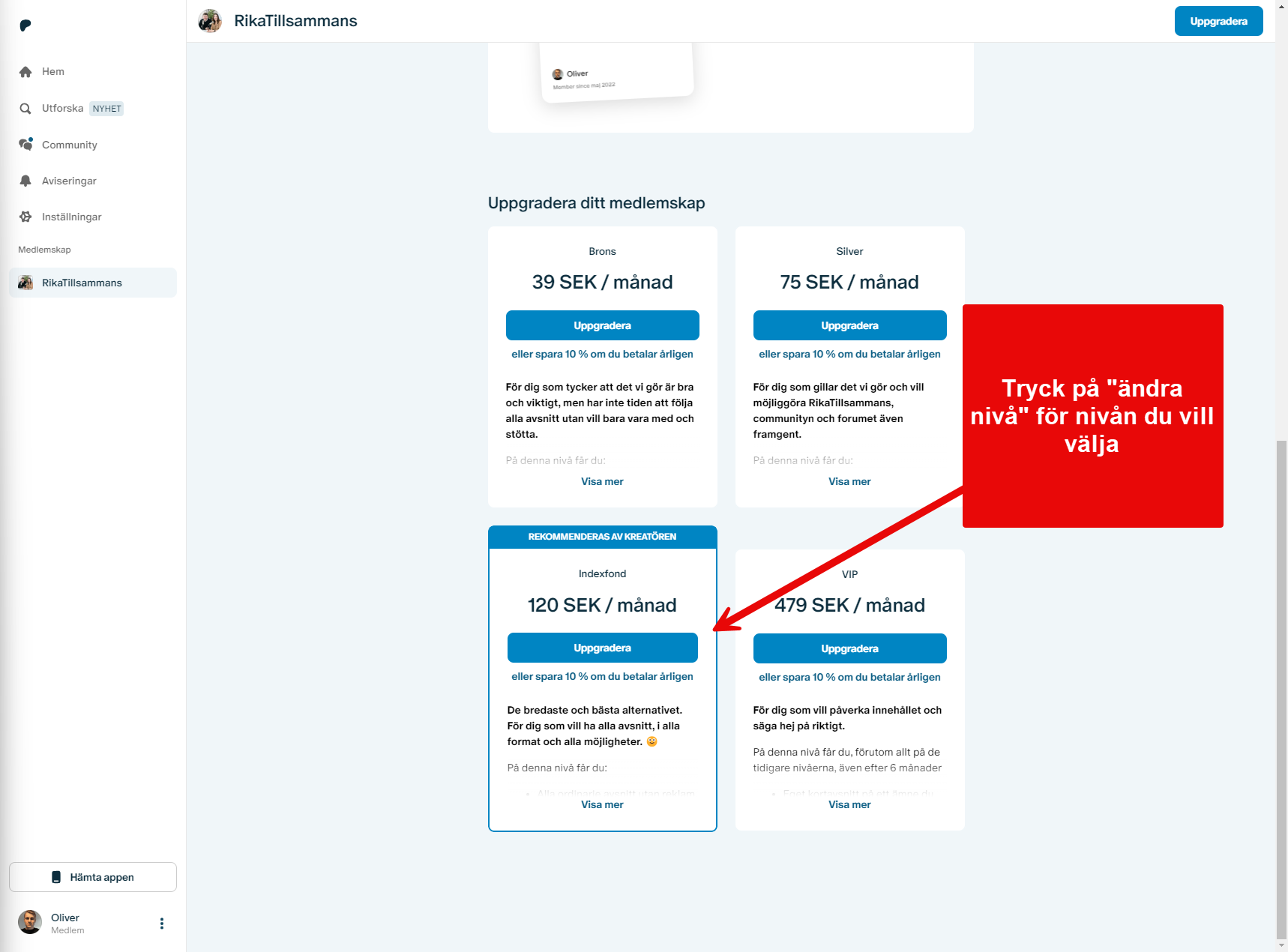 För att nedgradera eller uppgradera nivå på Patreon för Rikatillsammans behöver du följa fyra steg.