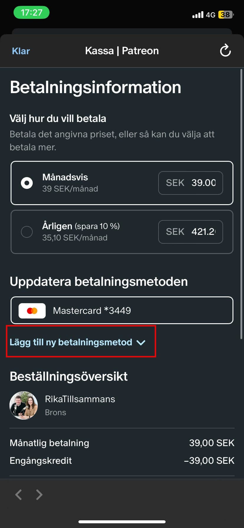 - Följ instruktionerna på sidan för att lägga till en ny betalningsmetod och radera därefter inaktiva