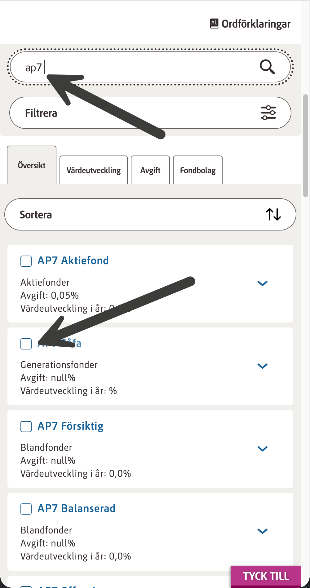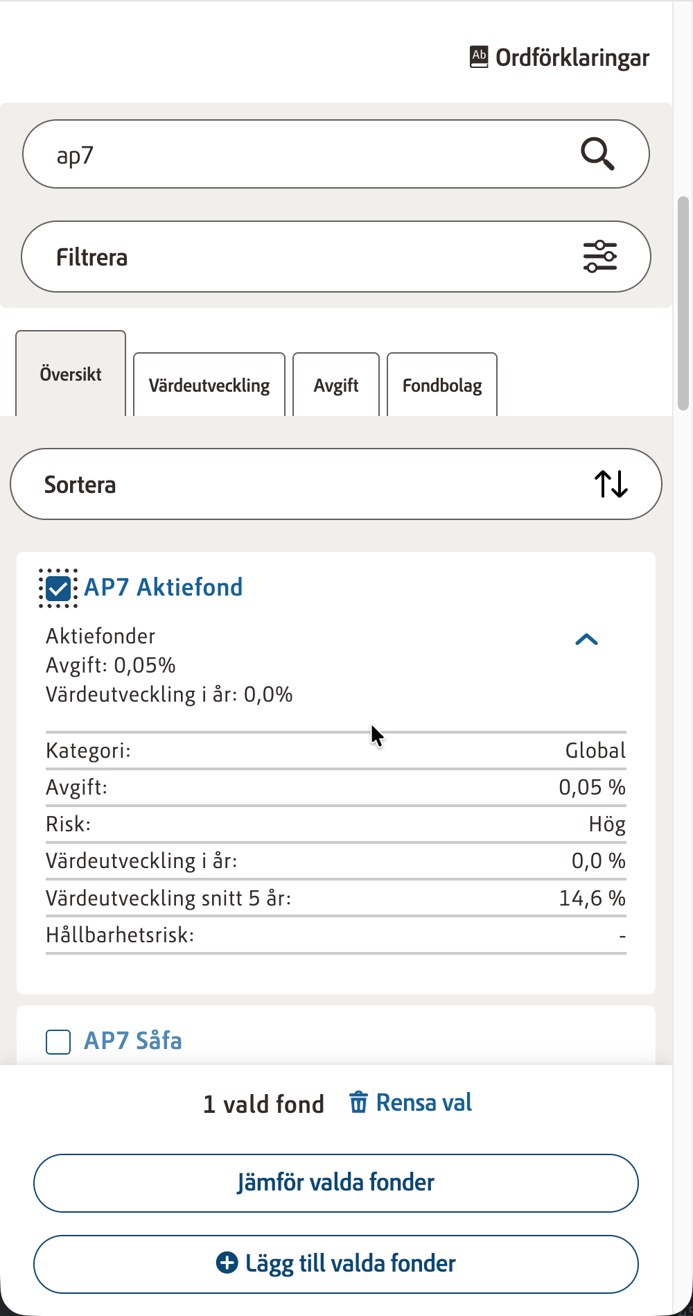 - Sök upp AP7 Såfa och välja fonden med det exakta namnet AP7 Såfa.