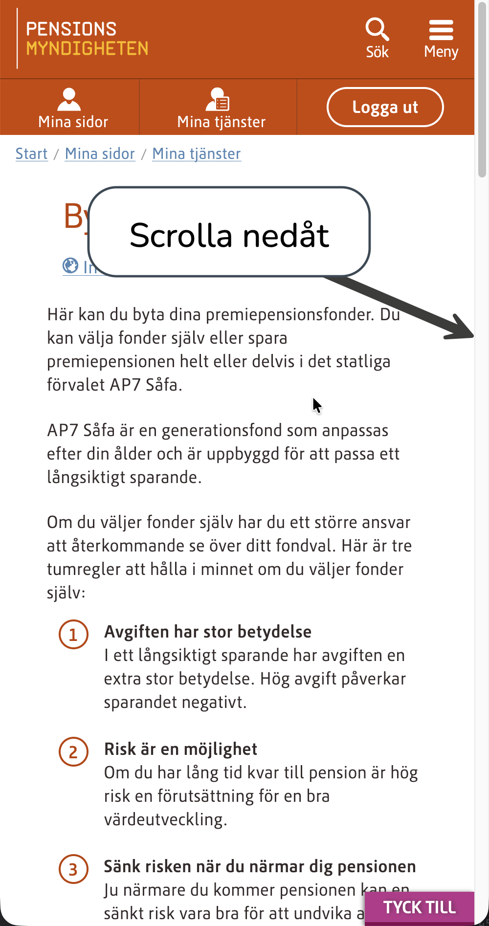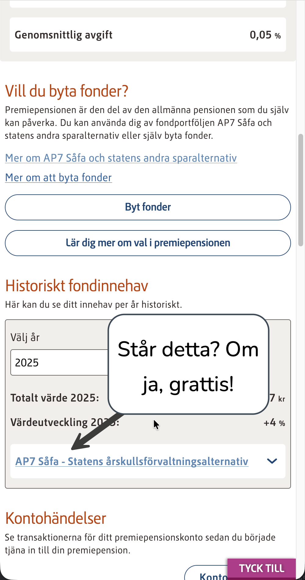 - Scrolla ner på sidan till historiska fondinnehav och se ifall du har AP7 Såfa (Om ja, grattis till dig