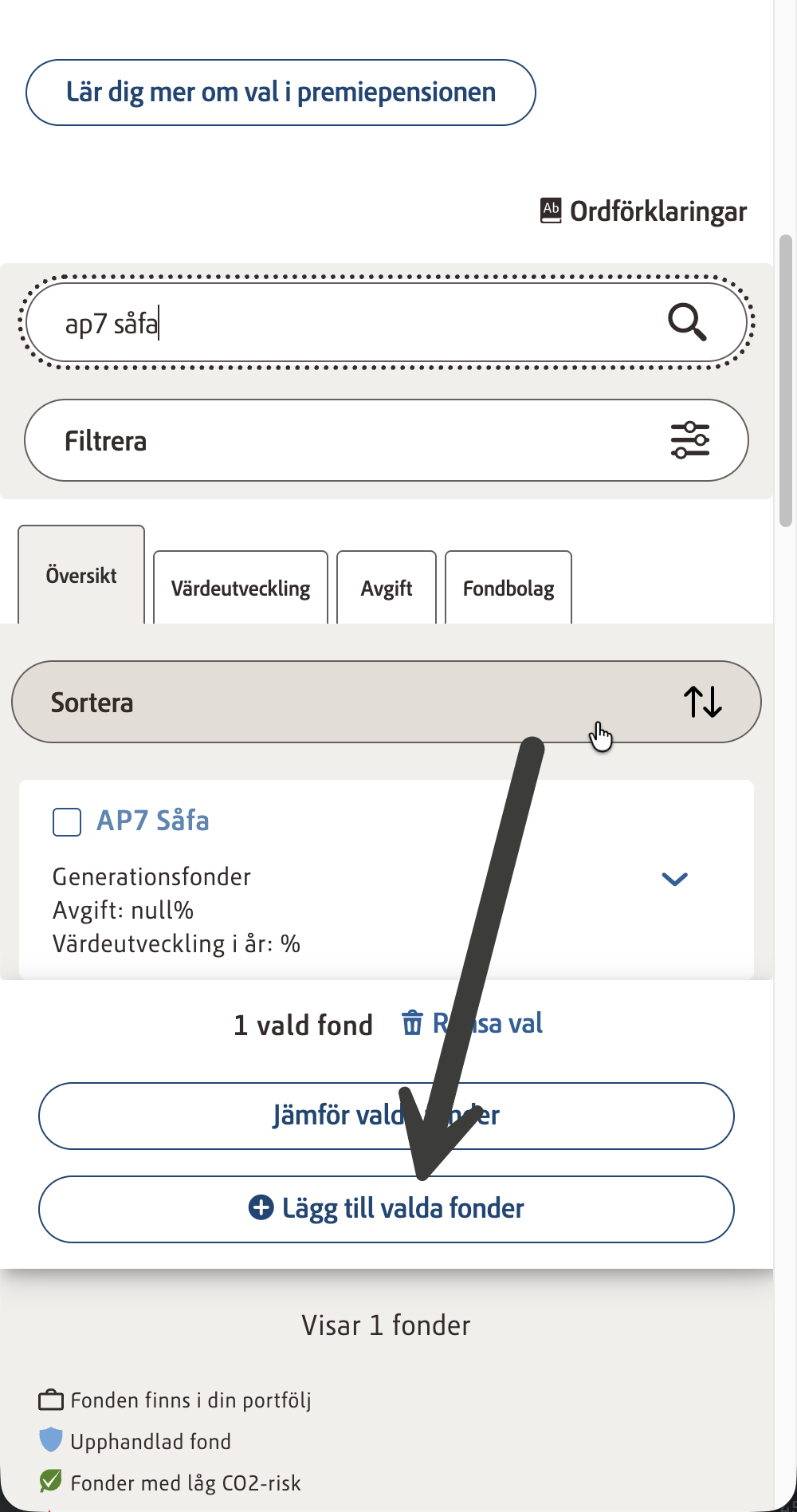 - Scrolla ner på sidan och tryck på “Lägg till eller jämför fonder”