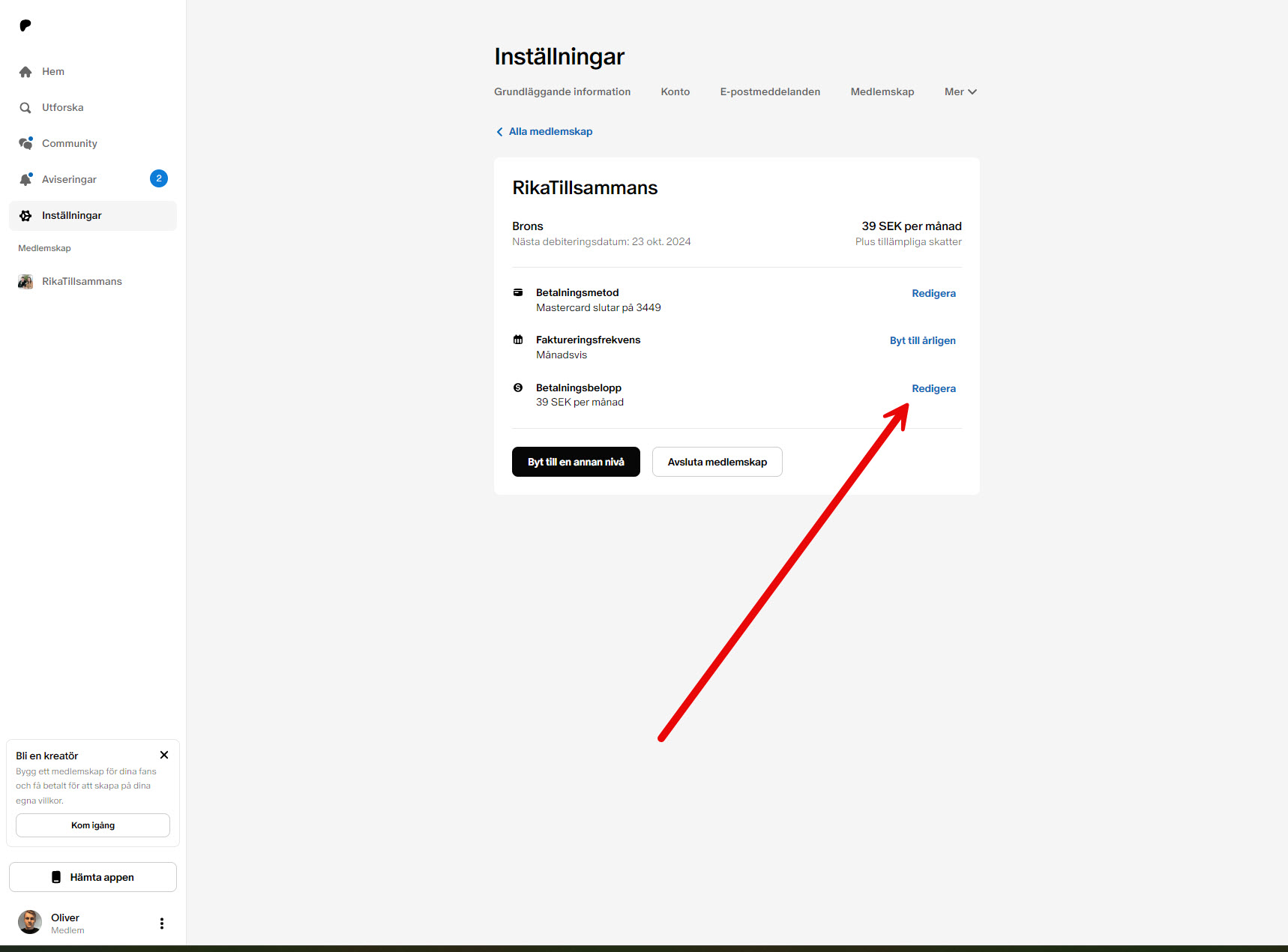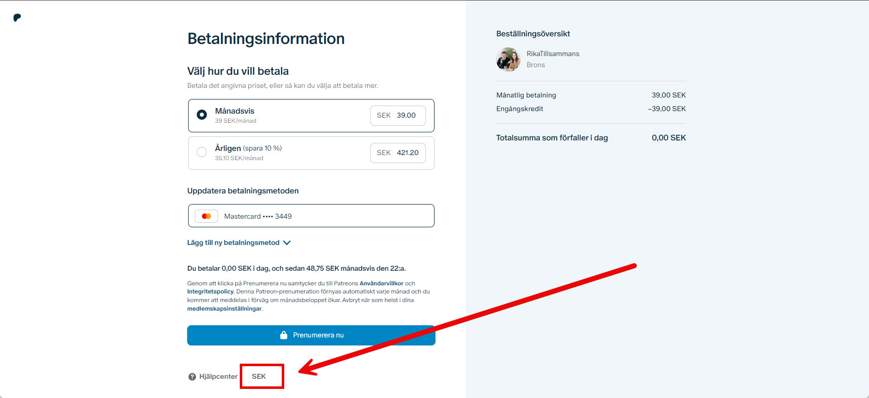 För att byta valuta på Patreon för Rikatillsammans behöver du göra följande i inloggat läge.