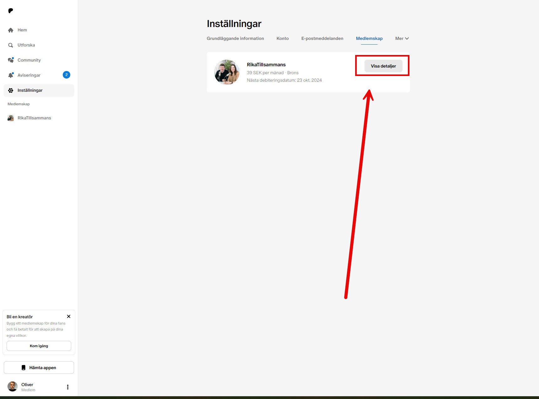 - Tryck på “visa detaljer” för medlemskapet: