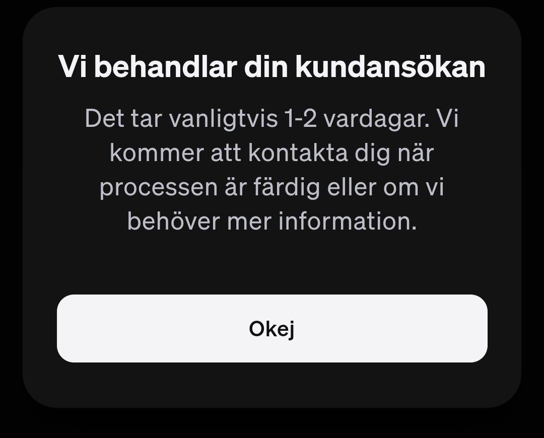 Det är möjligt att det är rätt begrepp. Först loggar man in med bank-ID och får fylla i de klassiska bankfrågorna. Väl inne i er app/hemsida så trycker man på öppna konto och får svar enligt bild.