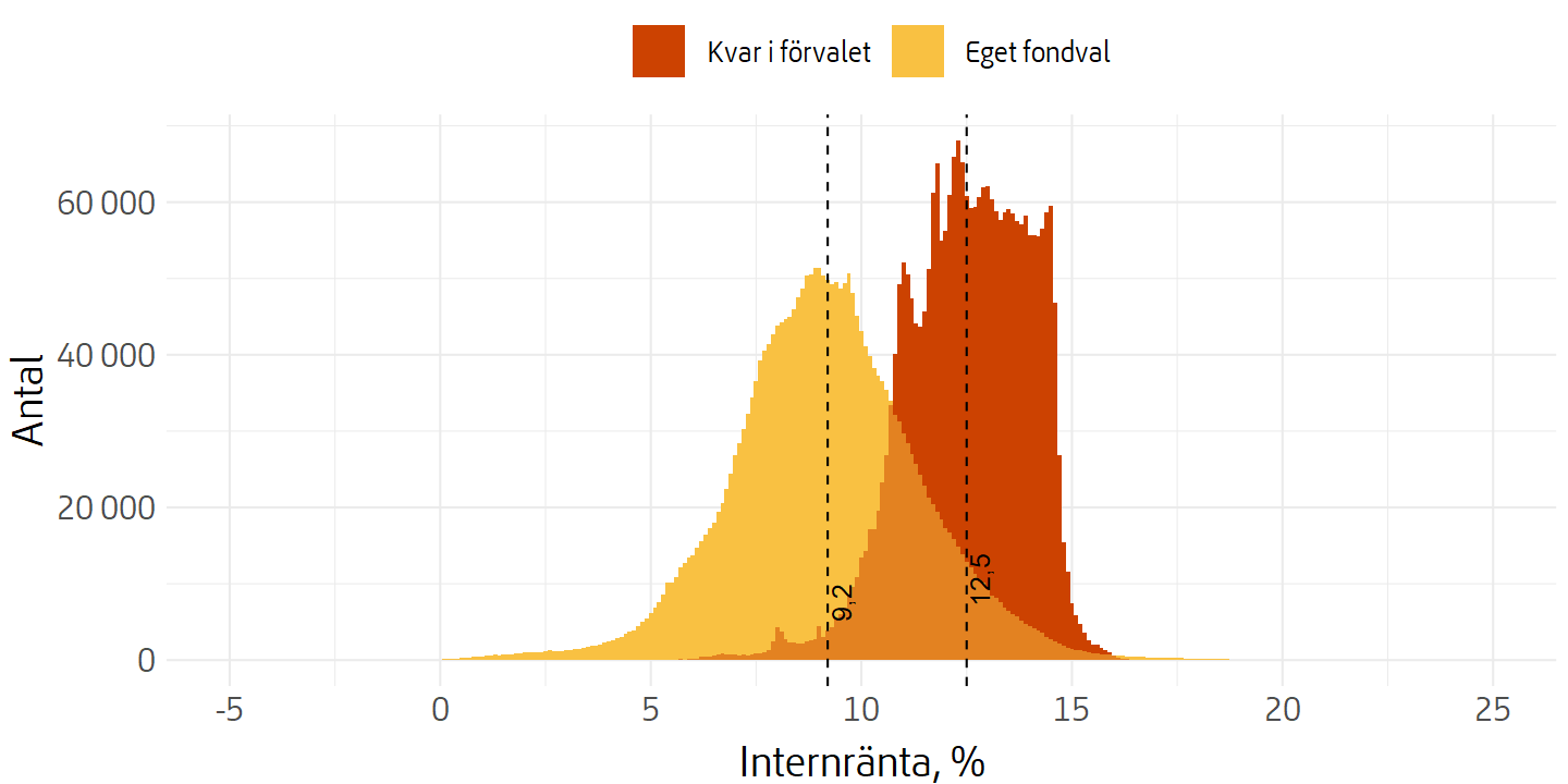 och avslutningsvis facit på hur det gått hittills (med understrykning att historisk avkastning inte är en garanti för framtida). Jämförelse av hur det har gått för AP7 SÅFA vs de som gjort egna val i Premiepensionen: