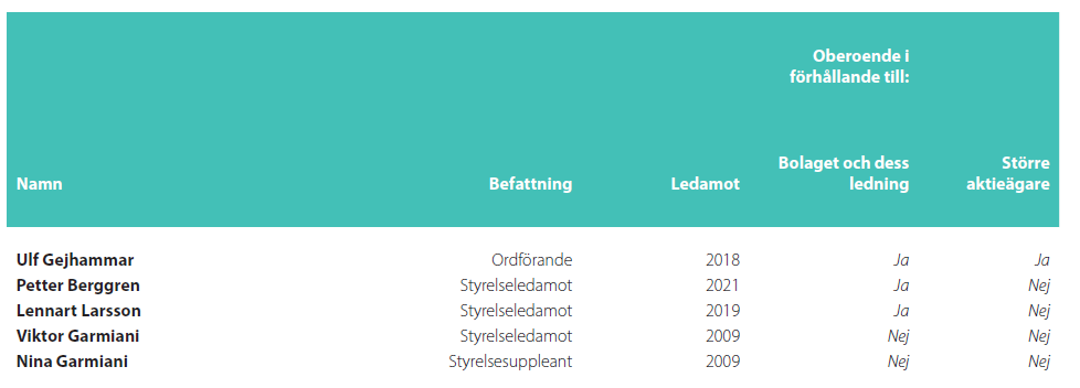 Större aktieägare: Nej på VD:n Viktor. Men sedan insåg jag ju att det är rubriken ovanför 3:e kolumnen som också gäller här, att han inte är oberoende i förhållande till större aktieägare.