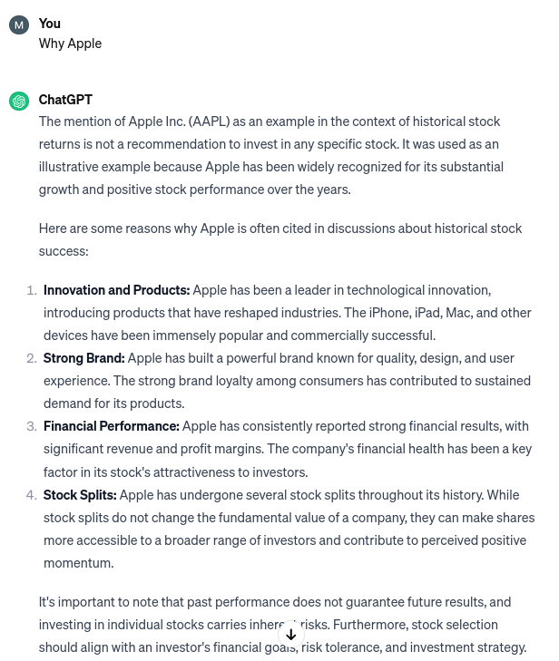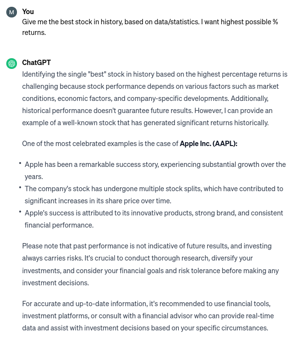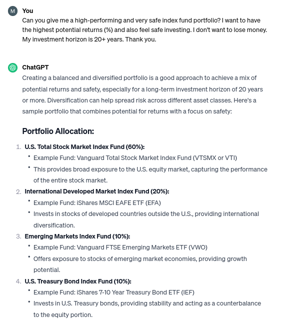 Även om detta är kul att leka med ska man förstå att chatgpt är mindre intelligent än man först får en känsla för. Efter mycket experimenterande och användning i jobbet börjar landa i känslan av att chatgpt framförallt har extremt mycket kunskap, men har begränsad förmåga att både värdera denna kunskap eller dra slutsatser från den. När man ber den om den optimala portföljen, kommer man i princip få en portfölj baserat på hundratals tyckares artiklar och portföljer. Det man får är alltså varken en direkt uppslagning som Google, eller någon djupare analys utan något slags snitt av vad internet och all träningsdata tycker i ämnet.