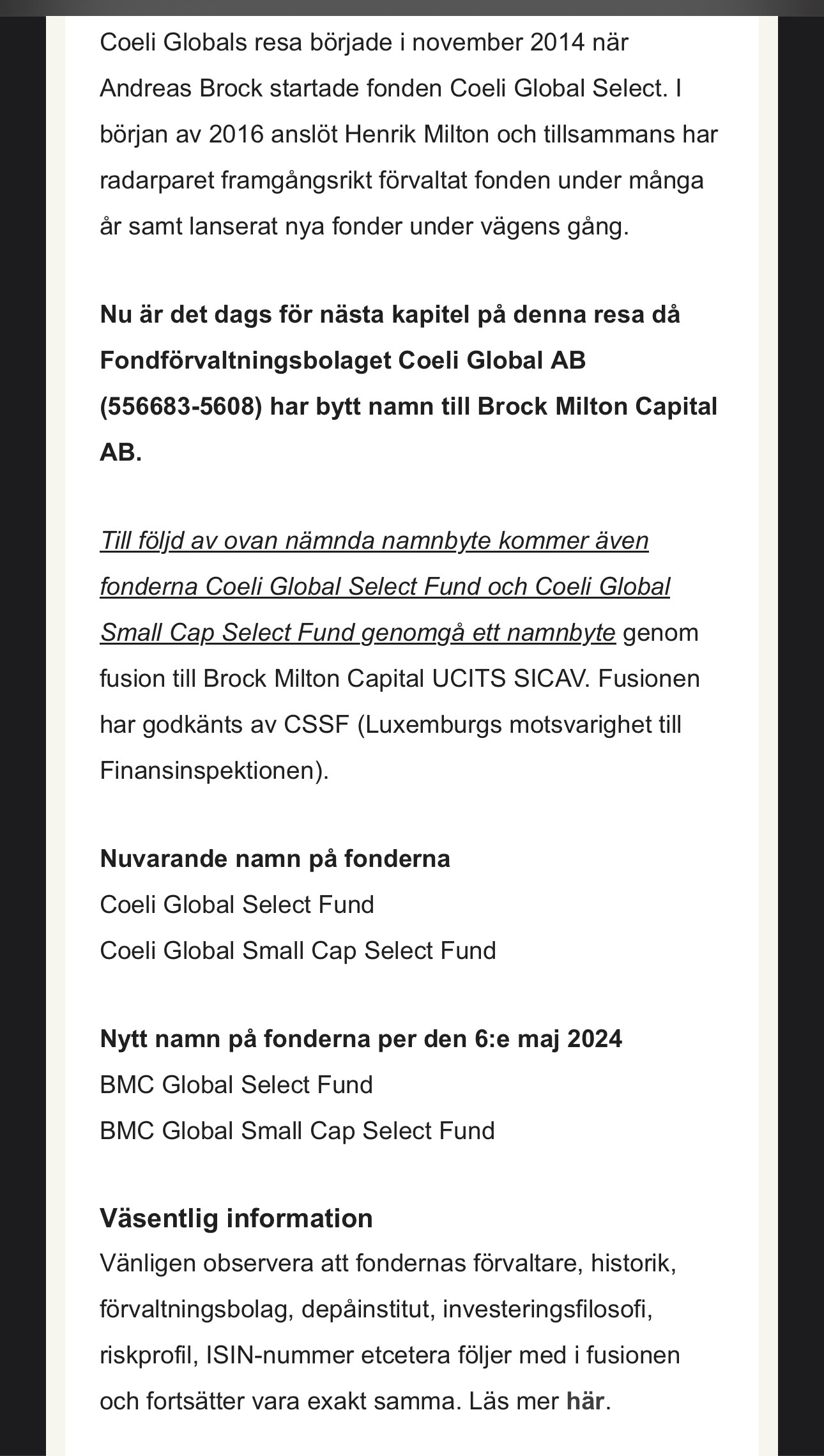 Vill också lägga till fotnoten att historisk avkastning inte säger något om framtida avkastning. Det är ingen som vet hur fonder eller aktier kommer gå i morgon eller i framtiden. Just en global indexfond är ett bättre alternativ för att ta ned risken, då den investerar i alla bolag enligt sitt index. En smal fond som den från Coeli investerar i 20-30 bolag och det krävs inte mer än att en handfull av dem skall gå riktigt dåligt, för att fonden som helhet går riktigt dåligt.