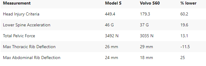 Mycket av det Tesla gör är en show cirkus. Samma sak med deras krocksimuleringar. Där de vid en stolpe in i sidan gav noll deformation av bilen. Där de jämförde med Volvo som då hade stora deformationer. Vilket alla Tesla fans blev lyriska om. Men sanningen är att accelerationerna på passagerarna i Tesla var på dödliga nivåer. Deformationerna i bilen är till för att sänka accelerationstopparna. Vilket Volvo är fantastiskt duktiga på att hantera. Jämförde man accelerationerna så hade en passagerare i Volvo betydligt högre chans att överleva.