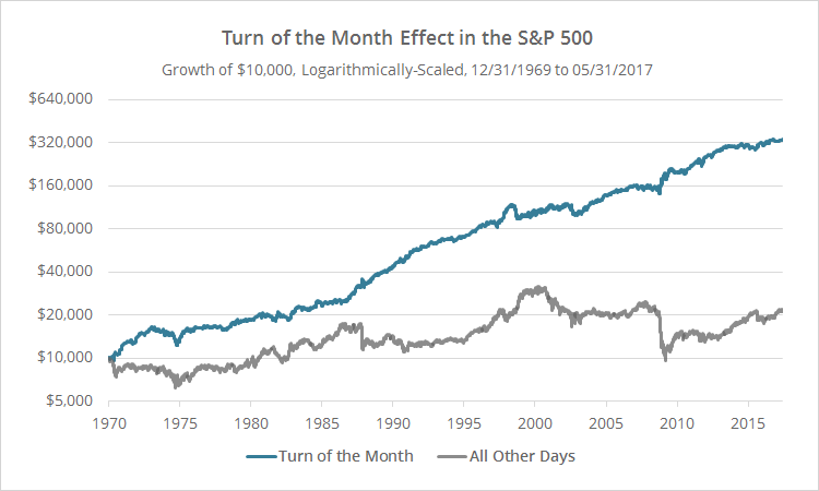 Om man varit investerad i S&P 500 enbart 4 dagar innan och 3 dagar efter ett månadsskiftet har man fått en något lägre avkastning till en avsevärt lägre risk. Som synes har det ibland tagit något decennium eller längre tid än så att återhämta sig från de negativa effekter som skapas av månadens alla andra dåliga dagar.
