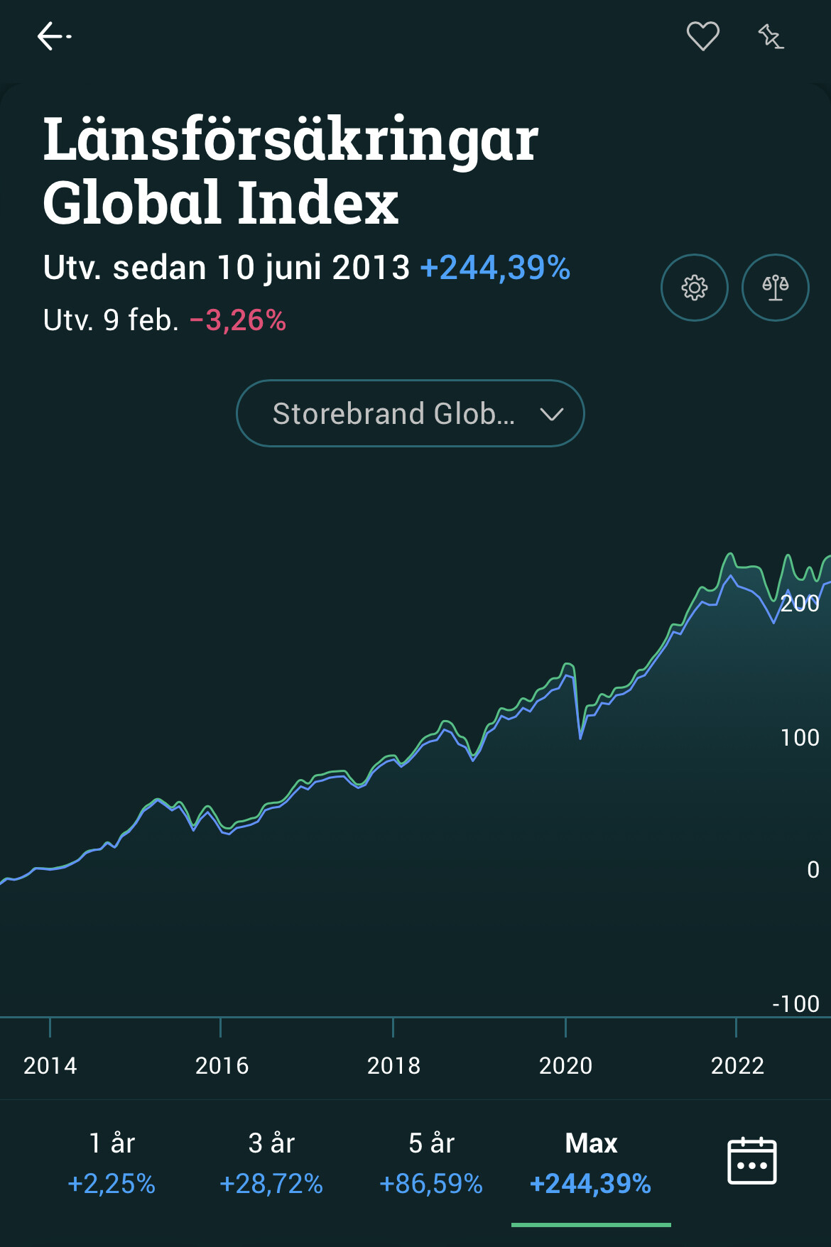 Jämför man tex LF global mot Storebrand All countries så har nästan identisk utveckling. Så lika bra att köra LF Global ensam. Så tänker jag. Så fall hade jag lagt till Sverige istället eller 10% lång räntefond