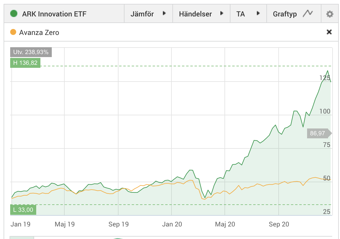 Kul att den gått jättebra, mindre kul att de flesta inte tjänar pengar på den stora uppgången, utan får typ S&P-avkastning eller sämre, men till högre risk (https://www.morningstar.com/articles/1071658/arkk-an-object-lesson-in-how-not-to-invest).